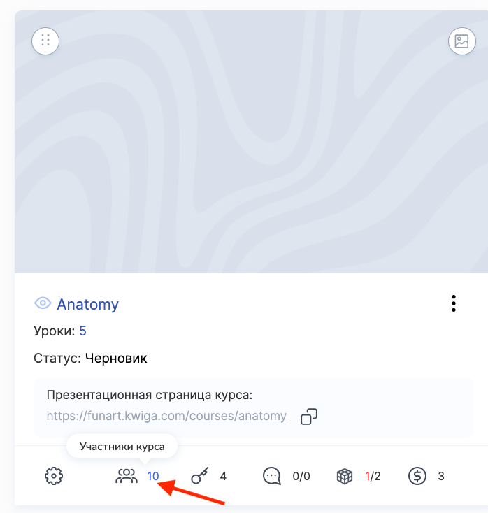 После запуска курса и добавления участников, все ключевые данные отображаются в деталях курса. Чтобы просмотреть, нужно перейти в меню Курсы, выбрать нужный курс и открыть вкладку Участники.