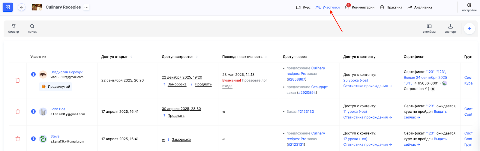 На странице отображаются имя и электронный адрес участника, даты открытия и закрытия доступа, а также название предложения, по которому предоставлен доступ. Вы также можете узнать, был ли выдан сертификат после завершения курса, и увидеть последнюю активность участника непосредственно на курсе. Это помогает быстро идентифицировать тех, кто прекратил обучение или нуждается в дополнительной поддержке.