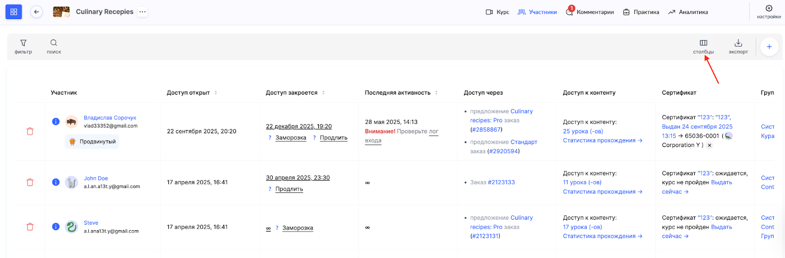 Вы можете настроить, какие столбцы отображать на этой странице — для этого воспользуйтесь кнопкой Столбцы в правом верхнем углу. Это особенно удобно, когда вам нужно сосредоточиться на конкретных показателях или работать с большим количеством участников.