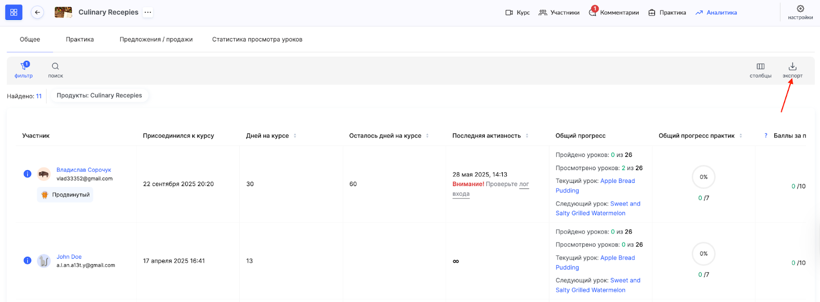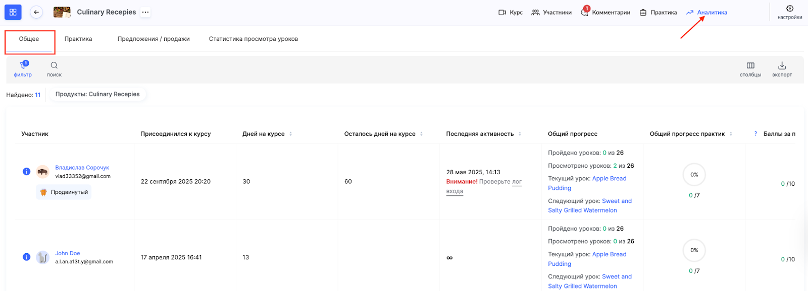 Для более глубокого анализа прогресса участников перейдите на курсе в меню Аналитика → вкладка Общее.