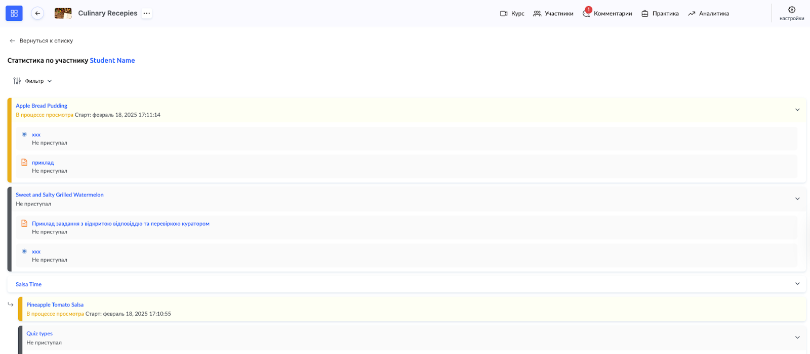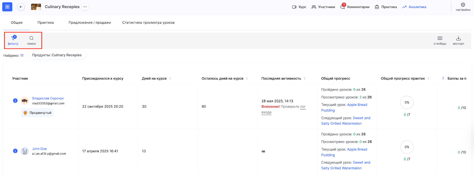 Помимо базовой информации, доступны данные о прогрессе обучения: процент просмотренных уроков и выполненных практических заданий. Эти показатели позволяют мгновенно оценить, насколько активно участник продвигается по курсу и выполняет ли он практические задания.