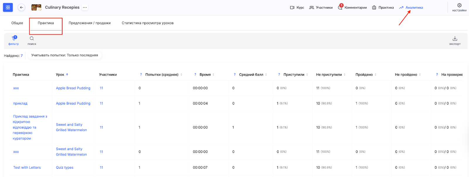 Вкладка Практика в меню Аналитика на курсе позволяет отслеживать выполнение практических заданий участниками. Этот отчет помогает оценить их прогресс, анализировать результаты и определять области, которые нуждаются в улучшении.