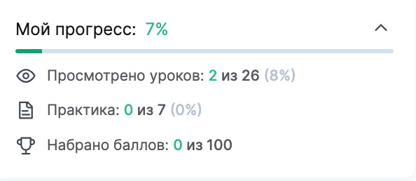 На страницах курса участник видит блок «Мой прогресс» с общим процентом прохождения. Здесь отображается количество просмотренных уроков из общего количества, количество выполненных практических заданий и общее количество набранных баллов.