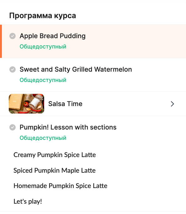 В программе курса возле названия каждого урока участник видит визуальные индикаторы статуса прохождения.
