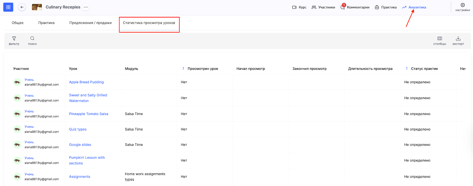 В дополнение к личной информации учеников, Вы можете получить информацию по каждому уроку или практике. Кликните на Экспортировать и получите файл в формате .csv или .xlsx, в котором будут указаны все просмотренные уроки, статус выполнения каждого задания, а также набранные баллы.