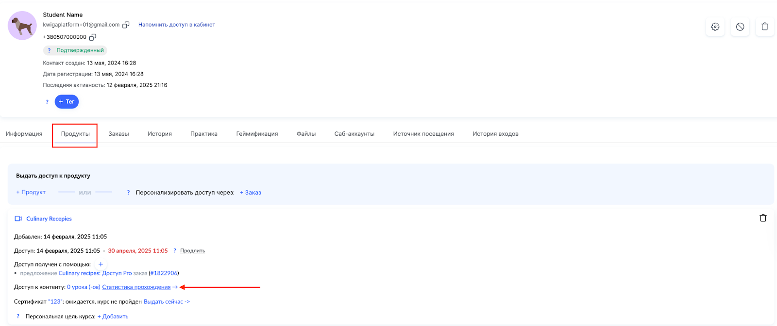 Здесь можно увидеть дату присоединения, сколько дней доступа уже использовано и сколько осталось, общий процент прогресса и процент выполненных практик. Также указываются набранные участником баллы за практические задания и дата последней активности. Если участник закреплен за куратором, указывается его имя, а также предложение или заказ, по которым был предоставлен доступ.