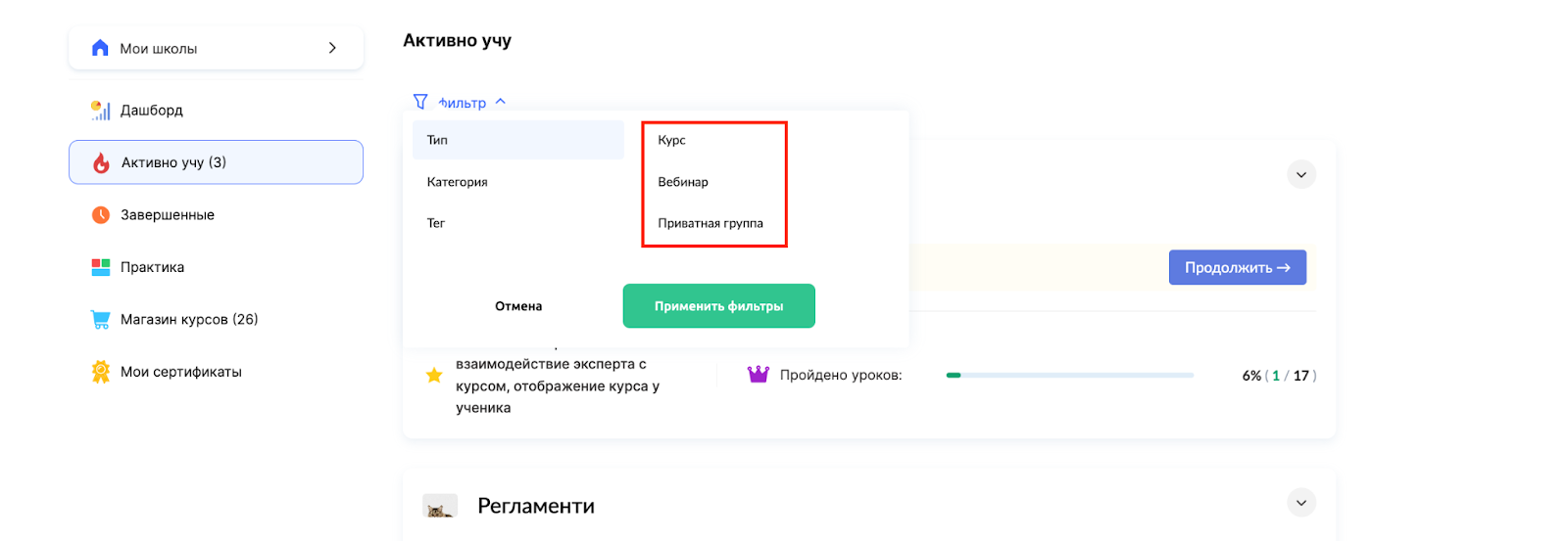 В профиле ученика есть три типа учебных продуктов: курсы (марафоны), вебинары и приватные группы.