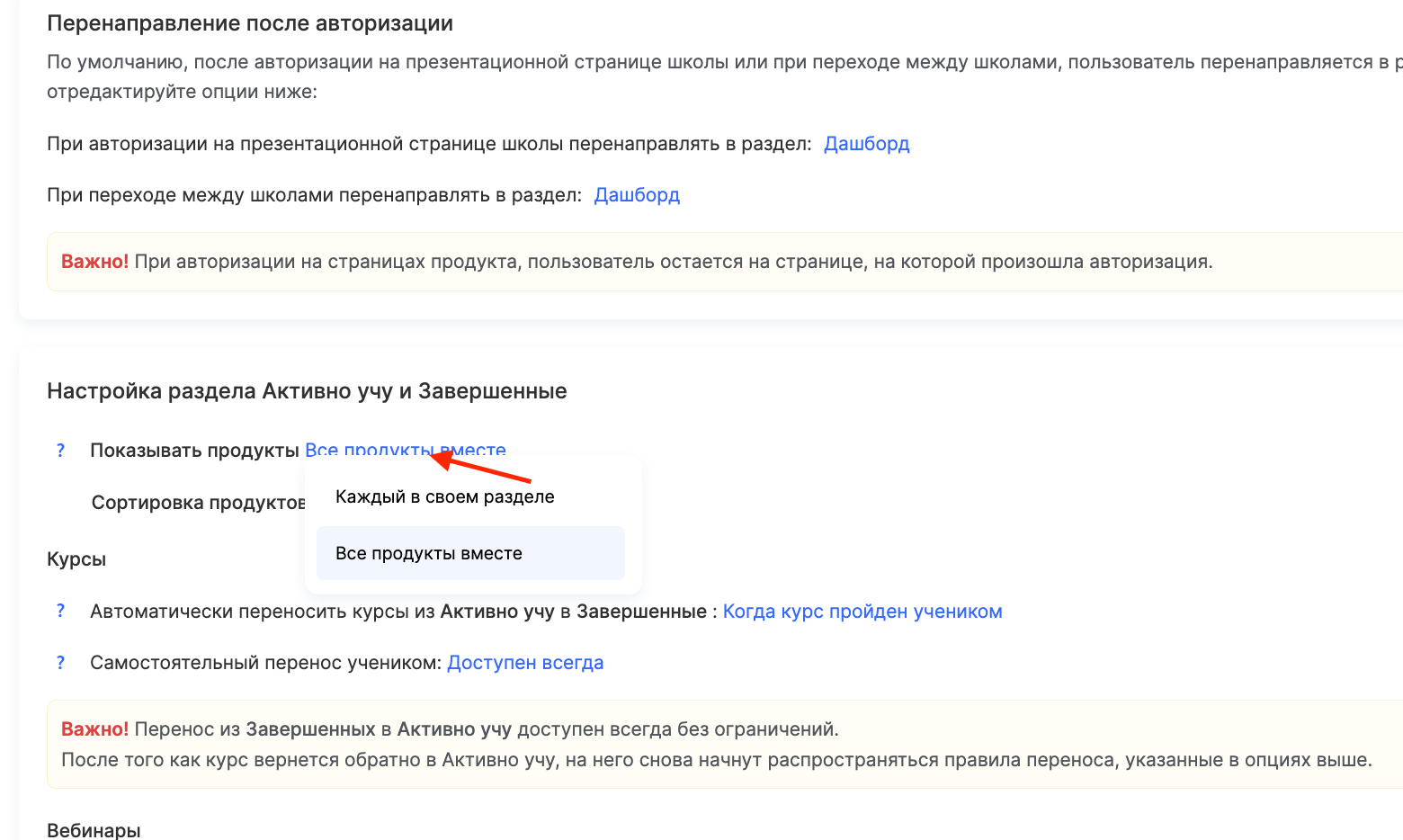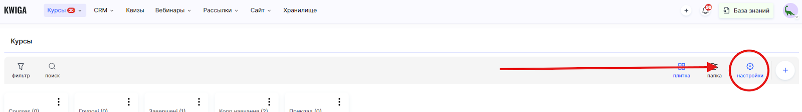 Для этого перейдите в меню «Курсы» и выберите один из разделов блока «Продукты» — например, «Курсы», — затем откройте Настройки.