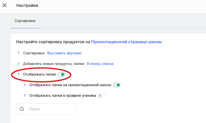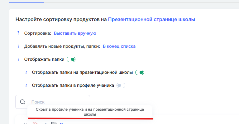 Вы сможете выбрать, отображать ли папки и показывать ли их на презентационной странице школы, используя соответствующие переключатели.