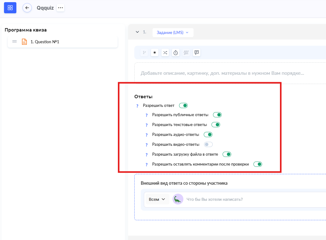 5. Настройте типы ответов — включите текстовые ответы, разрешите комментирование после проверки и, при необходимости, разрешите загрузку файлов (например, скриншотов).