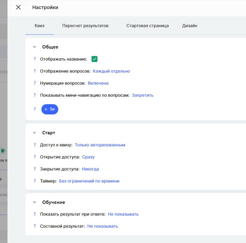 После создания квиза вы можете отредактировать его параметры в соответствии с потребностями технической поддержки, например: