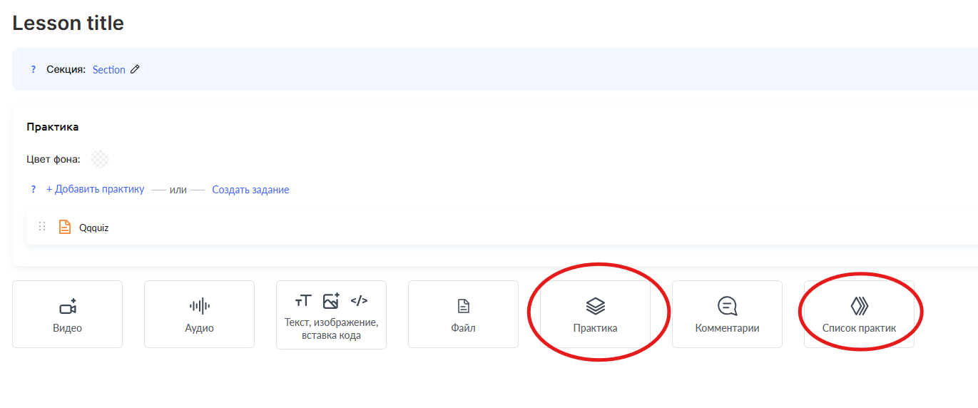 Практика (Practice) — выберите этот вариант, если поле должно быть частью материалов урока и отображаться сразу под содержимым урока.