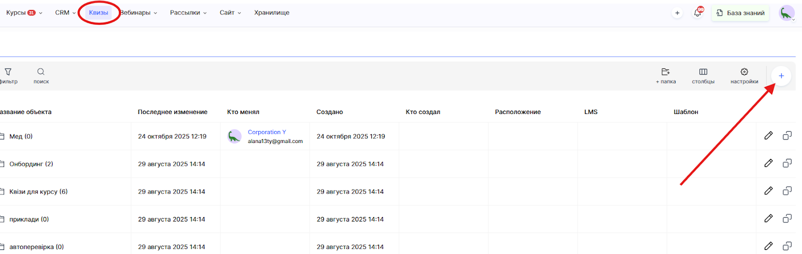 1. Перейдите в меню Квизы и нажмите + Квиз.