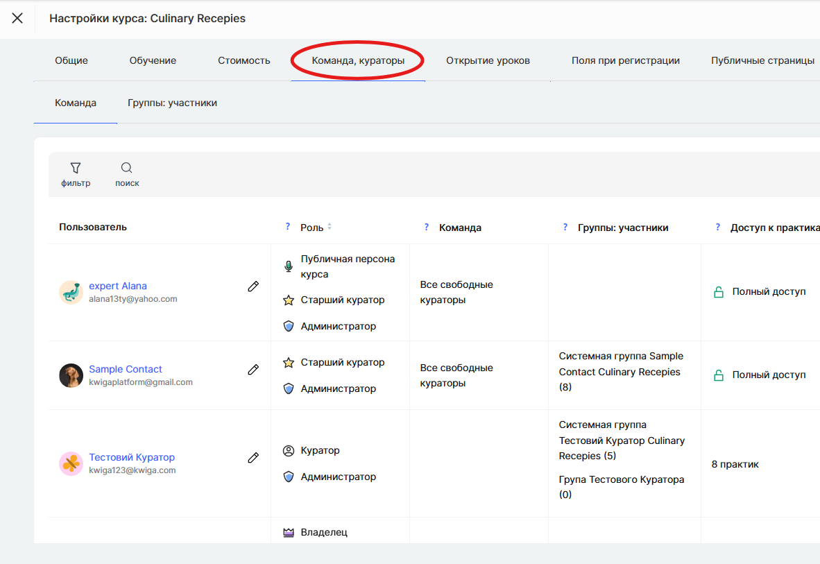 Необходимые параметры доступны прямо в курсе — на вкладке Команда → Кураторы.
