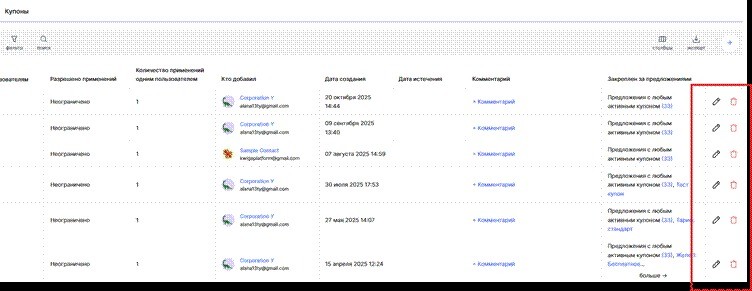 В списке купонов вы можете редактировать или удалять купоны с помощью соответствующих кнопок. Это позволяет быстро вносить изменения или удалять ненужные коды.