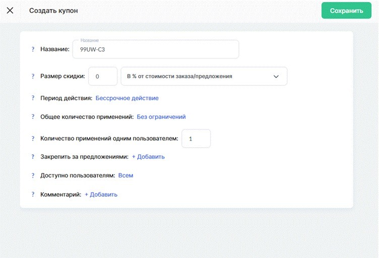 Комментарий — добавьте внутреннюю заметку о назначении купона.