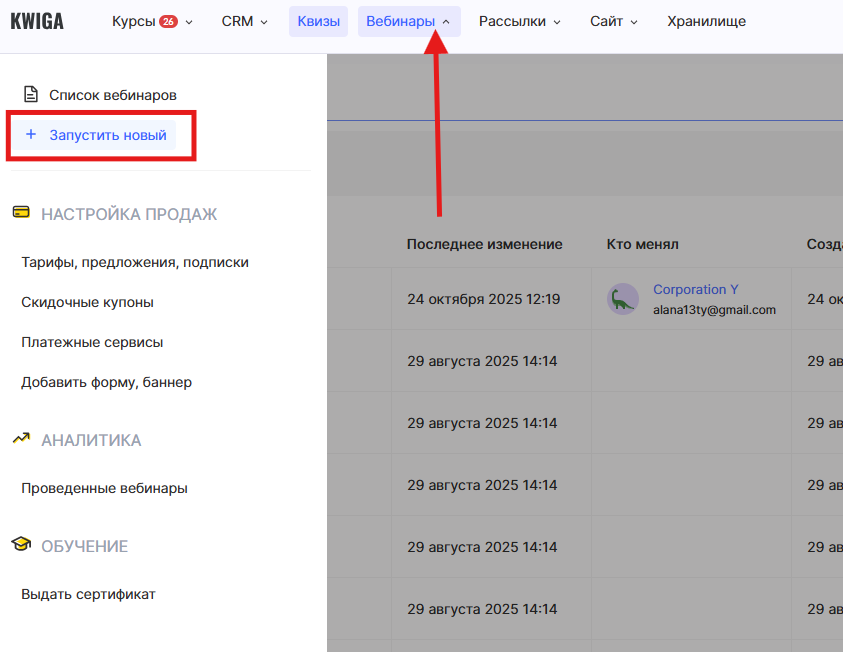 Чтобы создать вебинар: перейдите в меню «Вебинары» → «+ Запустить новый». Трансляция проводится с интеграцией с YouTube