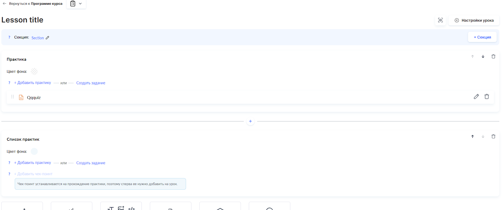 Для итоговой оценки добавьте практическое задание с помощью кнопки Practice внутри урока — тесты создаются отдельно в разделе «Quizzes».