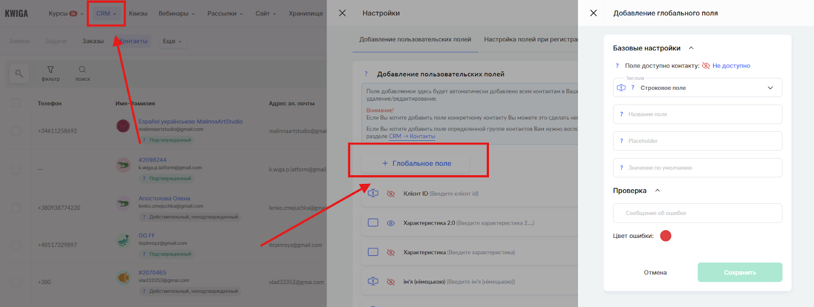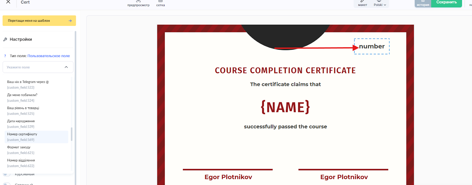 Создайте пользовательское глобальное поле для номера сертификата: CRM → Контакты → Настройки → + Глобальное поле