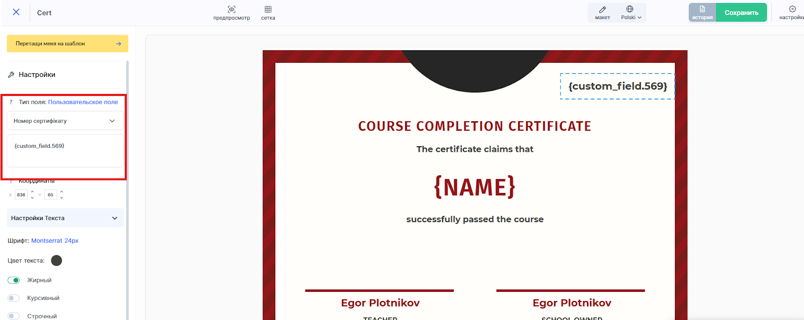 Сертификат настраивается в разделе «Настройки курса» → Education → Course Result. Там вы задаёте условия выдачи и при необходимости загружаете собственный шаблон.