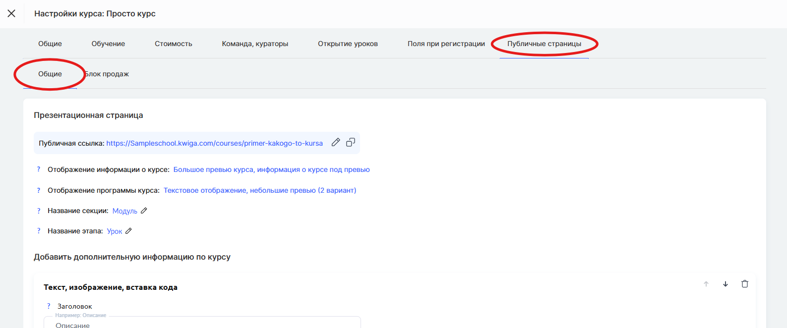 На вкладке Публичные страницы выберите раздел Общие и прокрутите вниз до пункта Страница урока / модуля.