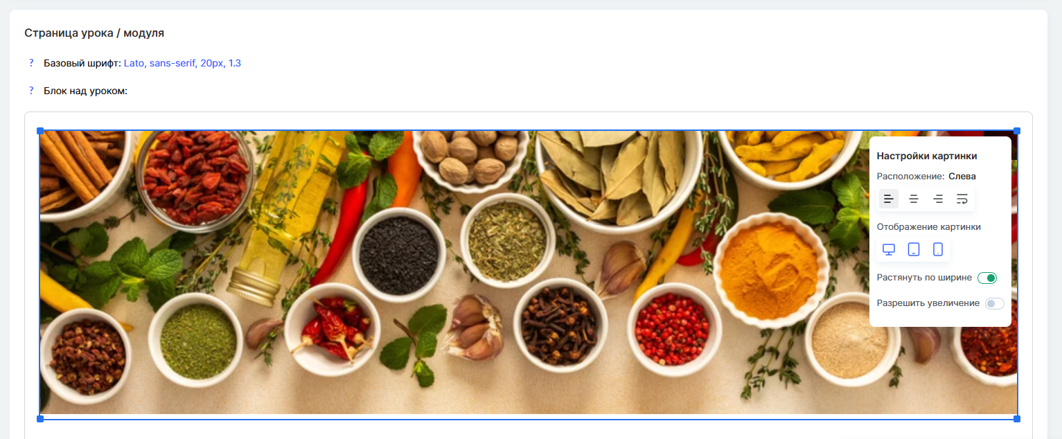 Если вы добавляете изображение в блок над уроками, вы можете настроить, как оно будет отображаться на разных устройствах.