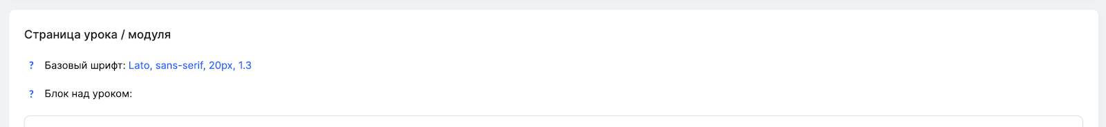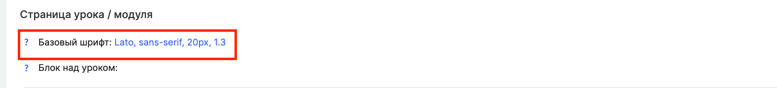 Для настройки нужно перейти в настройки курса на вкладку Публичные страницы, прокрутить вниз до блока Страница урока / модуля — пункт Базовый шрифт.
