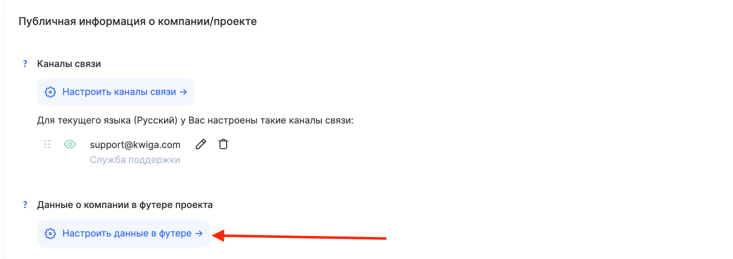 Далее в Публичная информация о компании/проекте и выберите пункт Данные о компании в футере проекта.