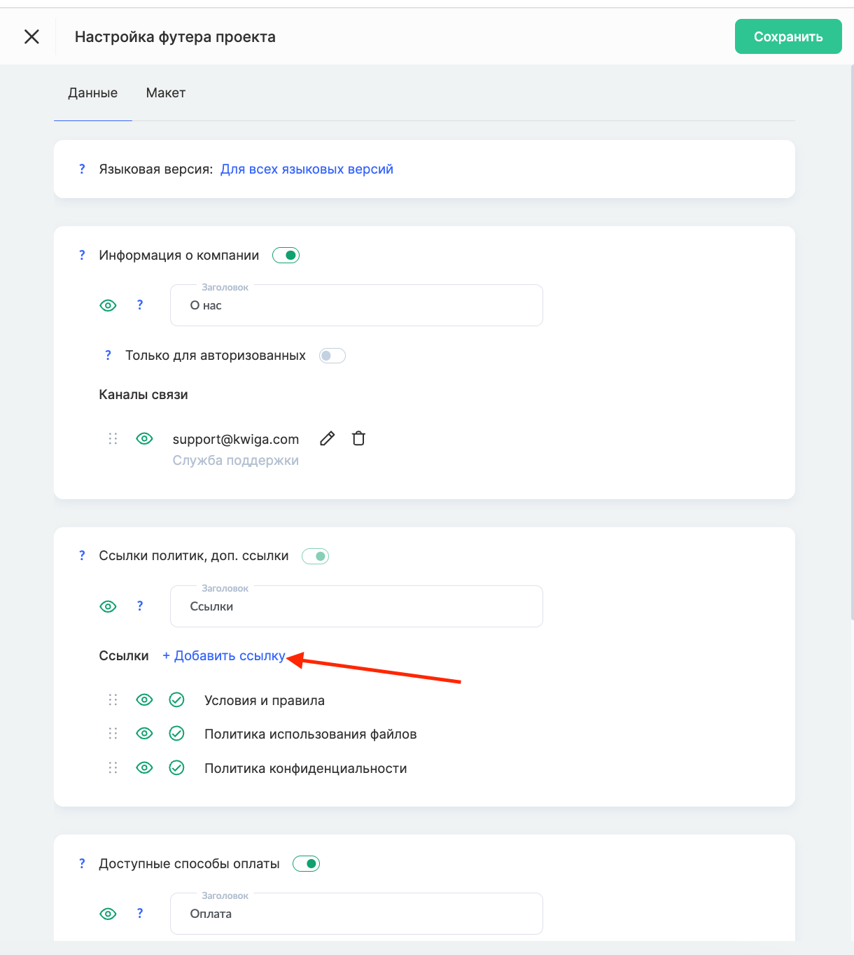 Система позволяет настраивать языковые версии для международной аудитории, включать или отключать блок Информация о компании, а также добавлять собственные ссылки через кнопку Добавить ссылку.