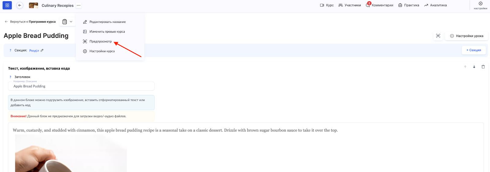 Чтобы сделать программу курса еще более структурированной, можно добавить изображение-превью к каждому уроку. Оно будет отображаться рядом с названием урока в программе курса, помогая студентам лучше ориентироваться в материале.