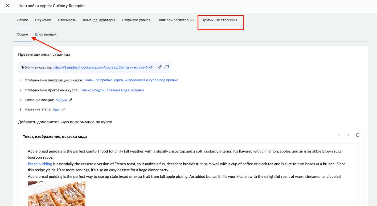 Для добавления нужно перейти в настройки курса на вкладку Публичные страницы, прокрутить вниз до блока Страница урока / модуля — поле Блок над уроком.