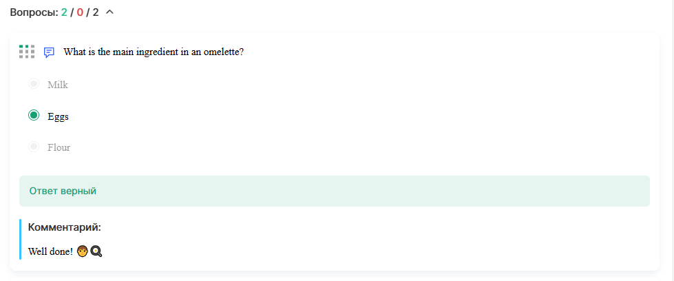 Если вы выбрали опцию Сразу при ответе на вопрос, комментарий появится сразу после того, как ученик даст ответ на вопрос. Это позволяет получить мгновенную обратную связь и понять логику ответа еще во время прохождения теста.