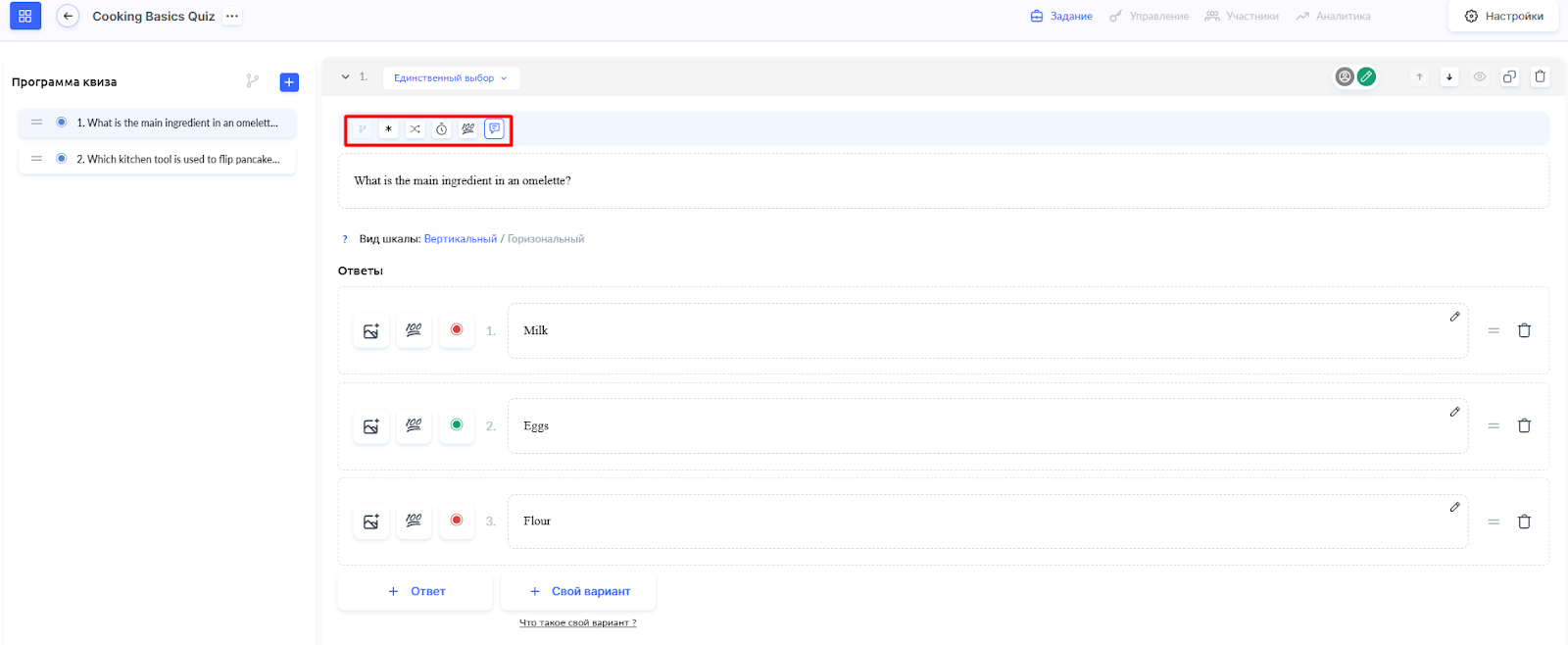 Добавьте текст вопроса и варианты ответов через кнопку +Ответ. Если тип вопроса предполагает правильный ответ, отметьте его зеленым.