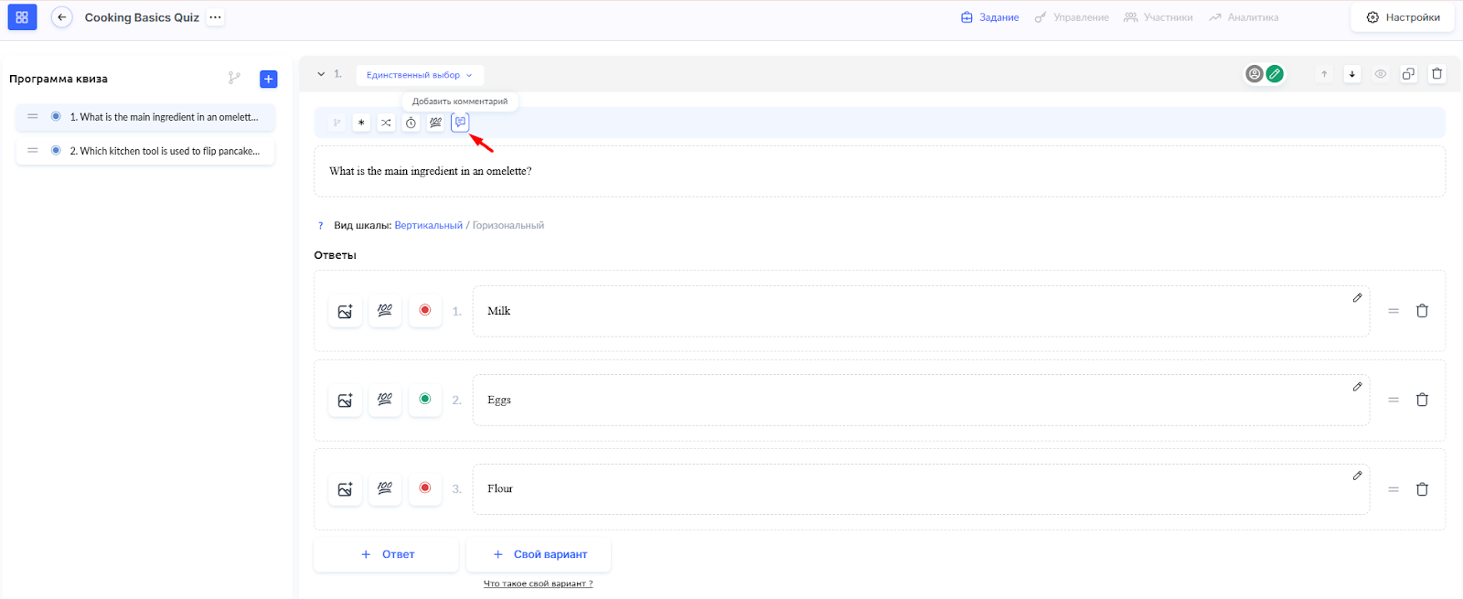 После создания вопроса и добавления вариантов ответов пришло время настроить комментарии.