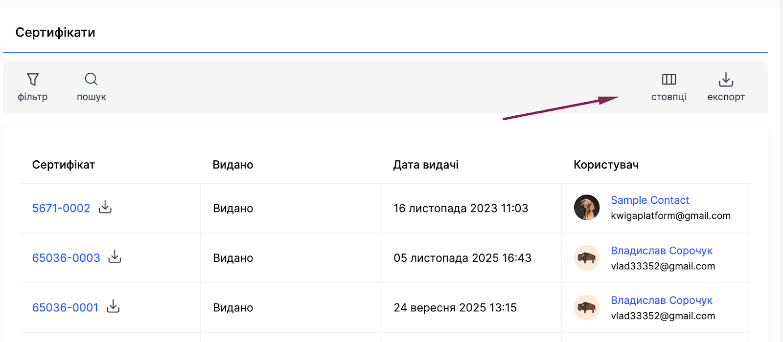 Сертифікат — унікальний номер сертифіката (наприклад, 5671-0002, 65036-0003). Біля кожного номера є кнопка завантаження для швидкого доступу до файлу сертифіката.