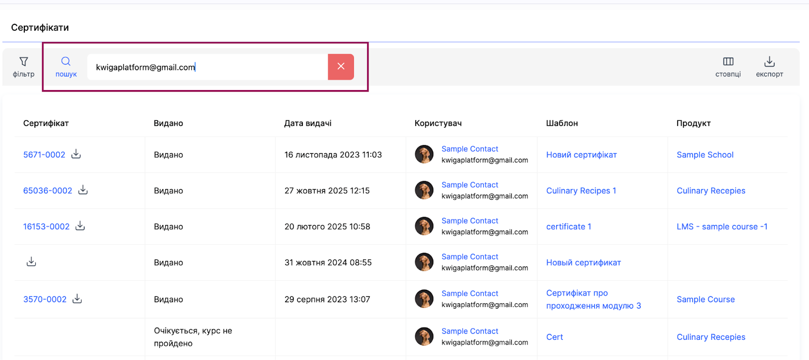 Просто введіть ім'я учня або його email-адресу в поле пошуку, і система відфільтрує результати, показуючи всі сертифікати, які отримав цей користувач. Це зручно для перевірки історії сертифікації окремого учня або для підготовки звітів про його досягнення.