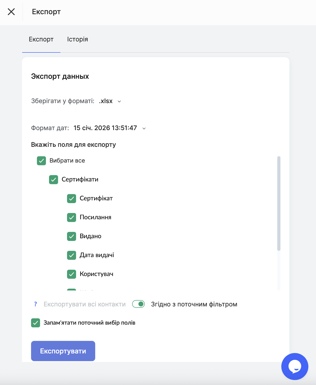 Експорт — можливість вивантажити дані про сертифікати в зовнішній файл для подальшої обробки або архівування.