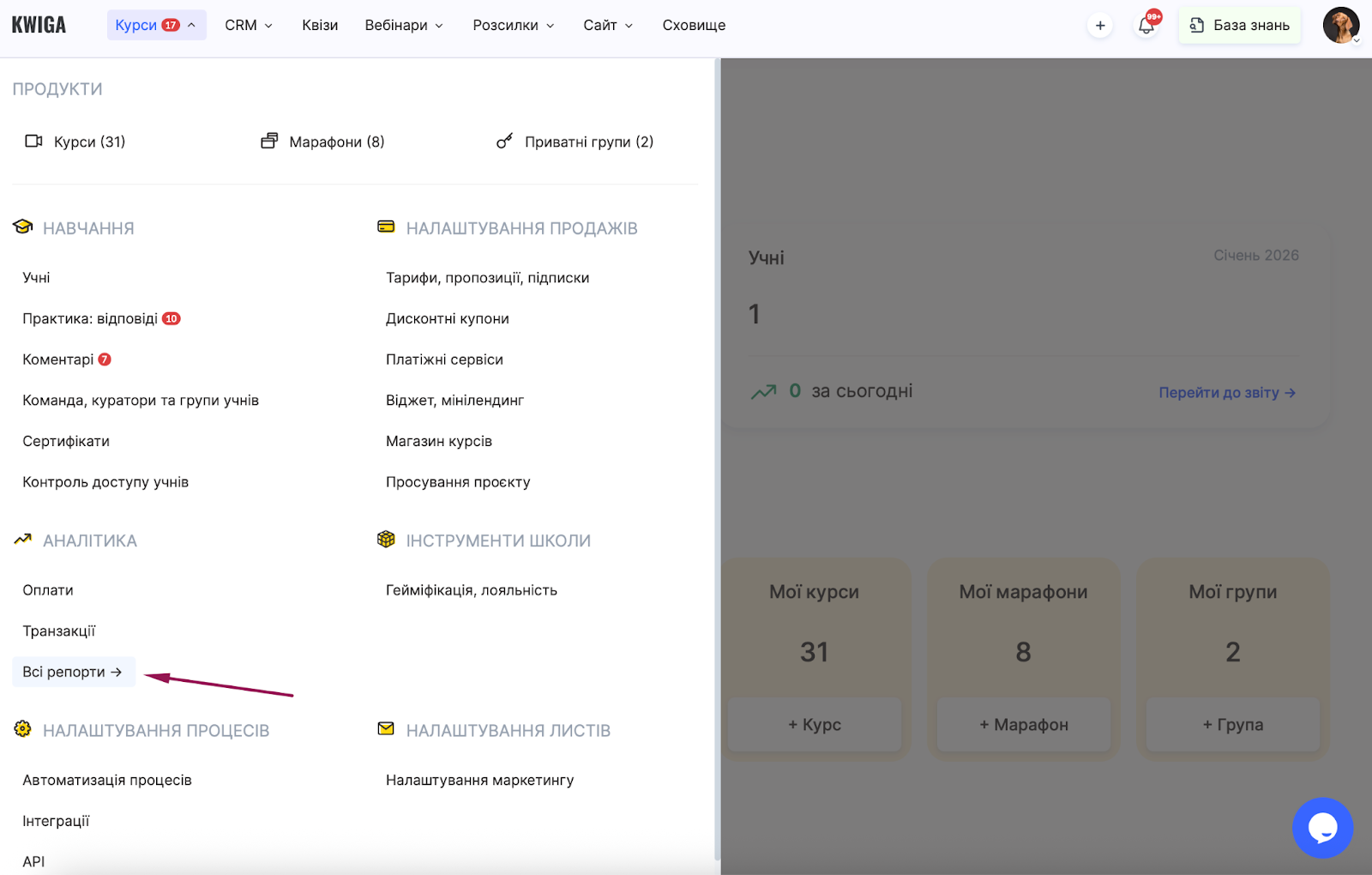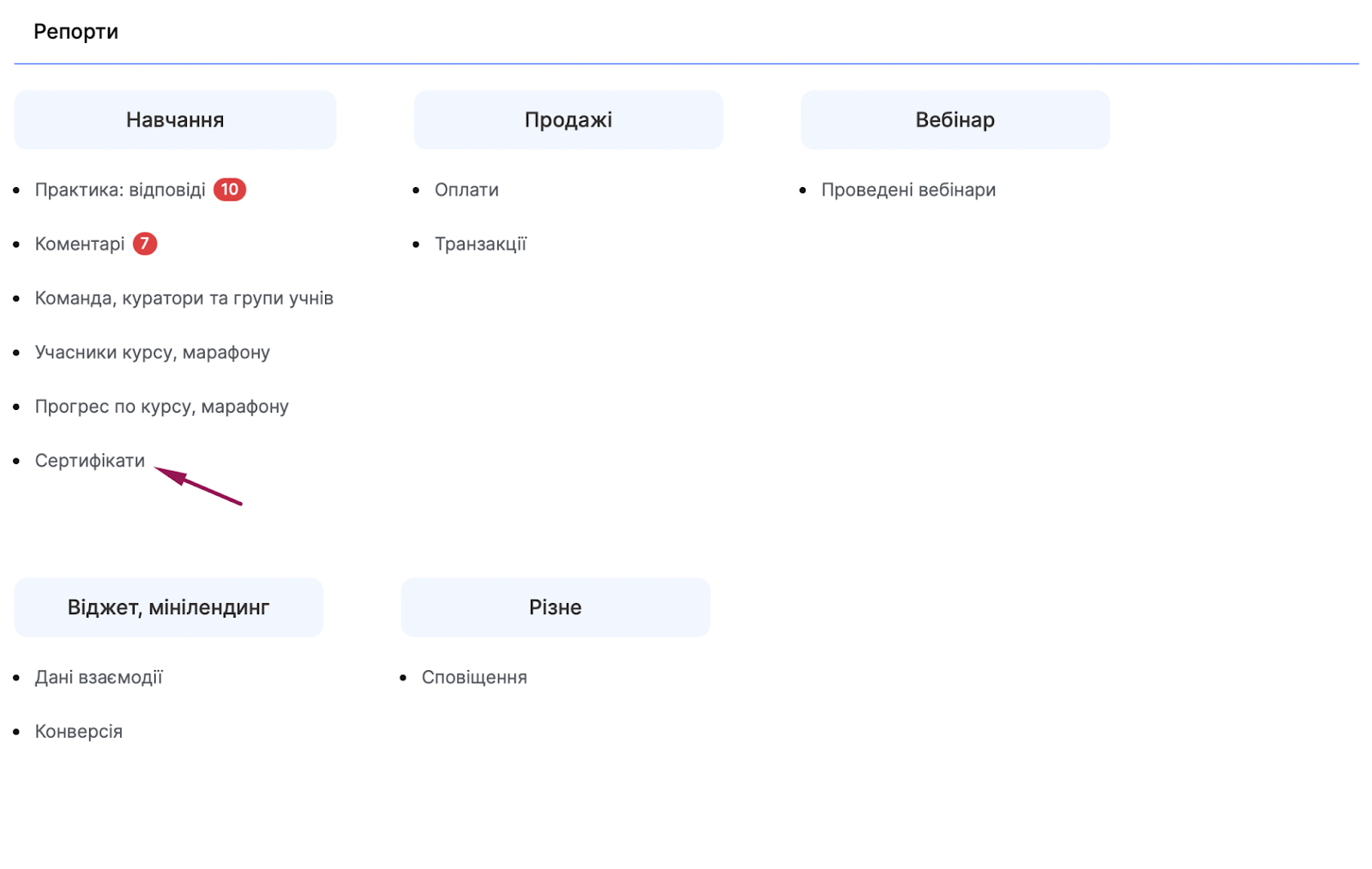 Щоб відкрити звіт про сертифікати, перейдіть до меню Курси → Репорти