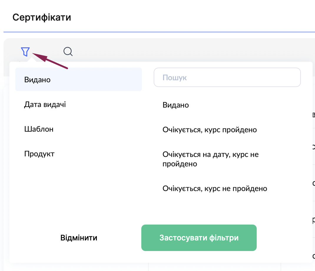 У верхній частині звіту доступний інструмент Фільтр, який дозволяє відбирати сертифікати за різними критеріями. Це особливо корисно, коли потрібно знайти конкретні документи серед великої кількості записів.