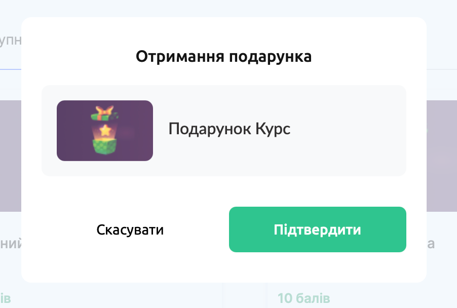 Процес обміну виглядає так: учень переглядає детальний опис та натискає на Отримати подарунок, підтверджує обмін, після чого отримує підтвердження та інструкції щодо подарунка.