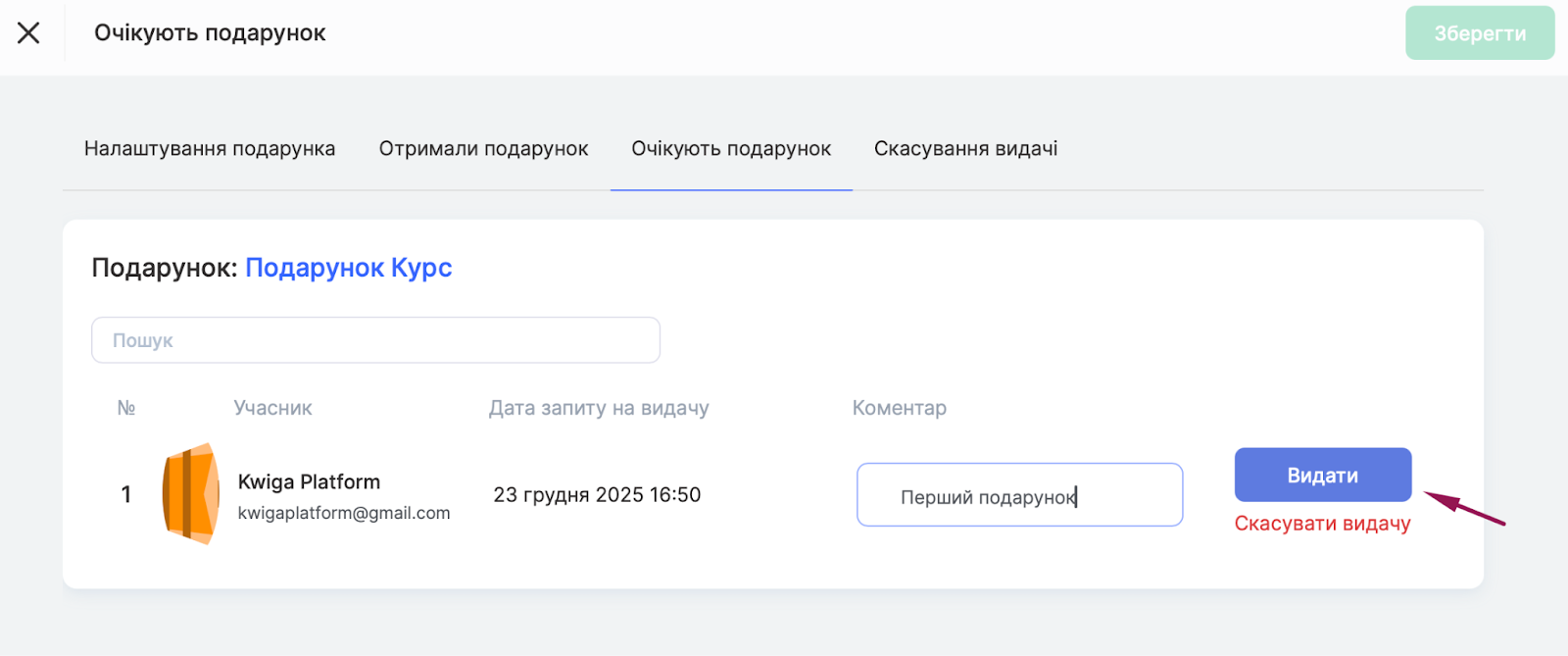 На вкладці Очікують подарунок ви можете вказати коментар, який буде видно лише адміністратору, та натиснути кнопку Видати або Скасувати видачу.