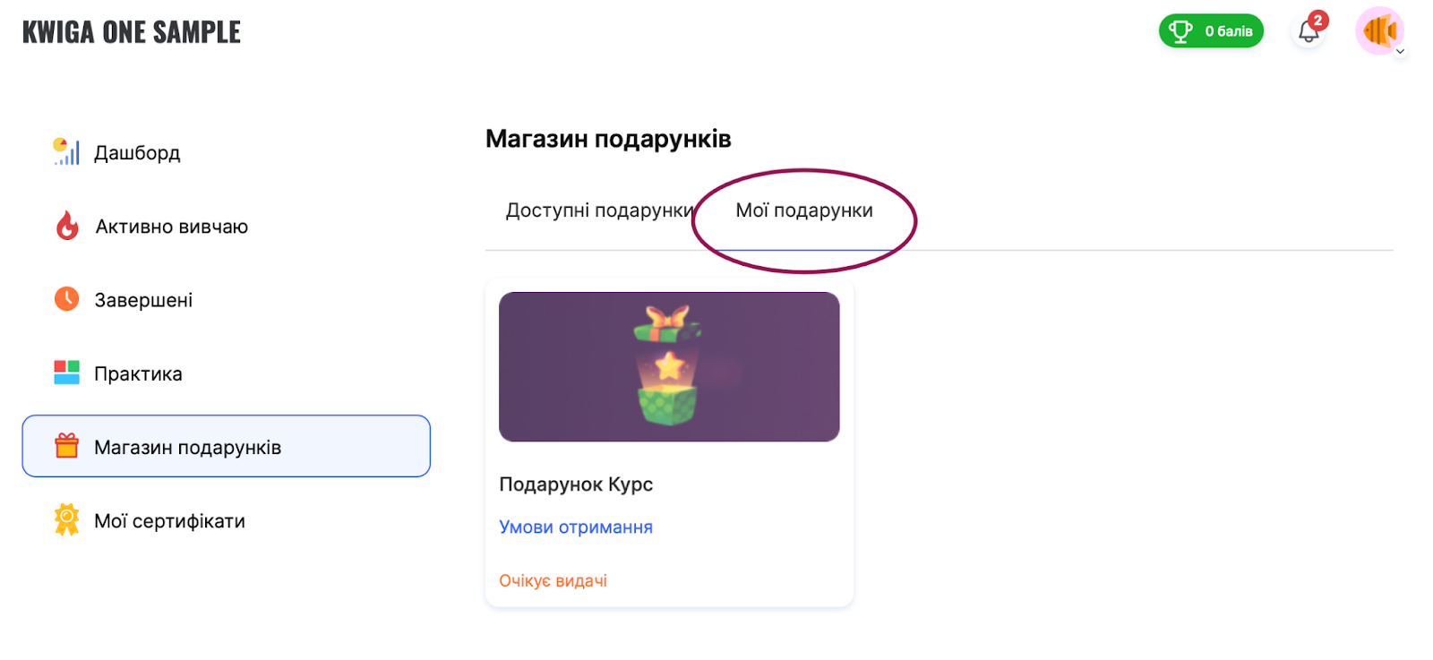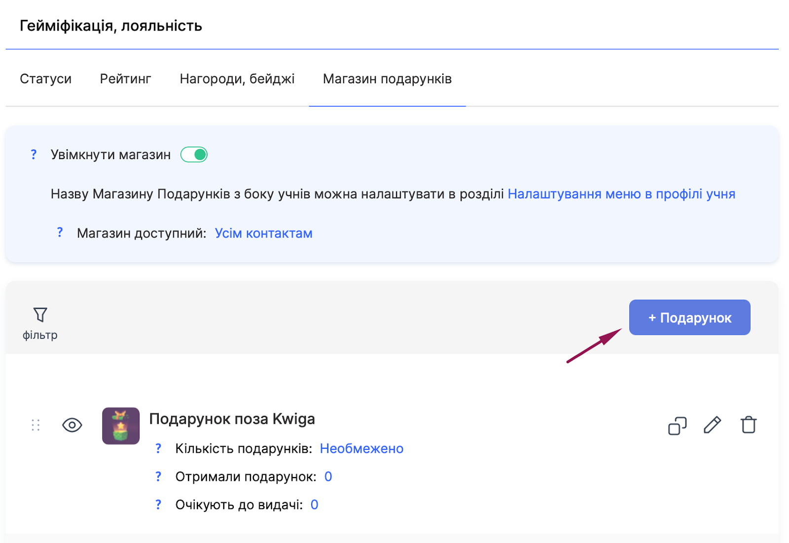 Магазин подарунків - це зручний інструмент геймифікації на платформі Kwiga, який дозволяє створювати винагороди для мотивації ваших учнів. За допомогою цього функціоналу ви можете заохочувати активність студентів, надаючи їм можливість обмінювати, наприклад зібрані бали на різноманітні подарунки.