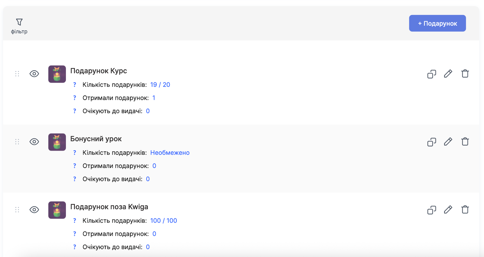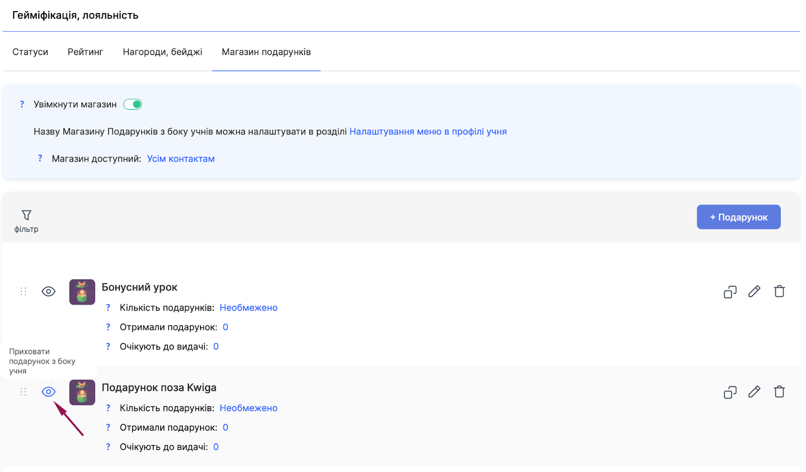Для кожного подарунка доступні функції: керування видимістю для учнів, дублювання, редагування та видалення. Іконка ока дозволяє показати або приховати відображення подарунка в профілі учнів.