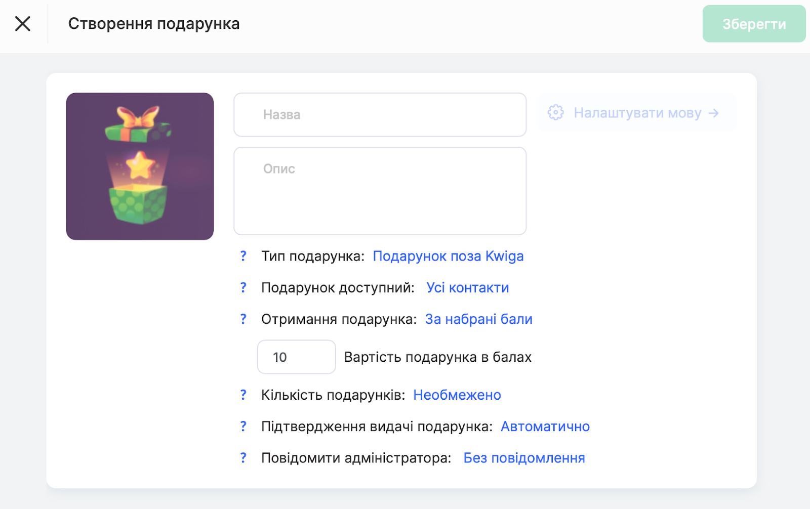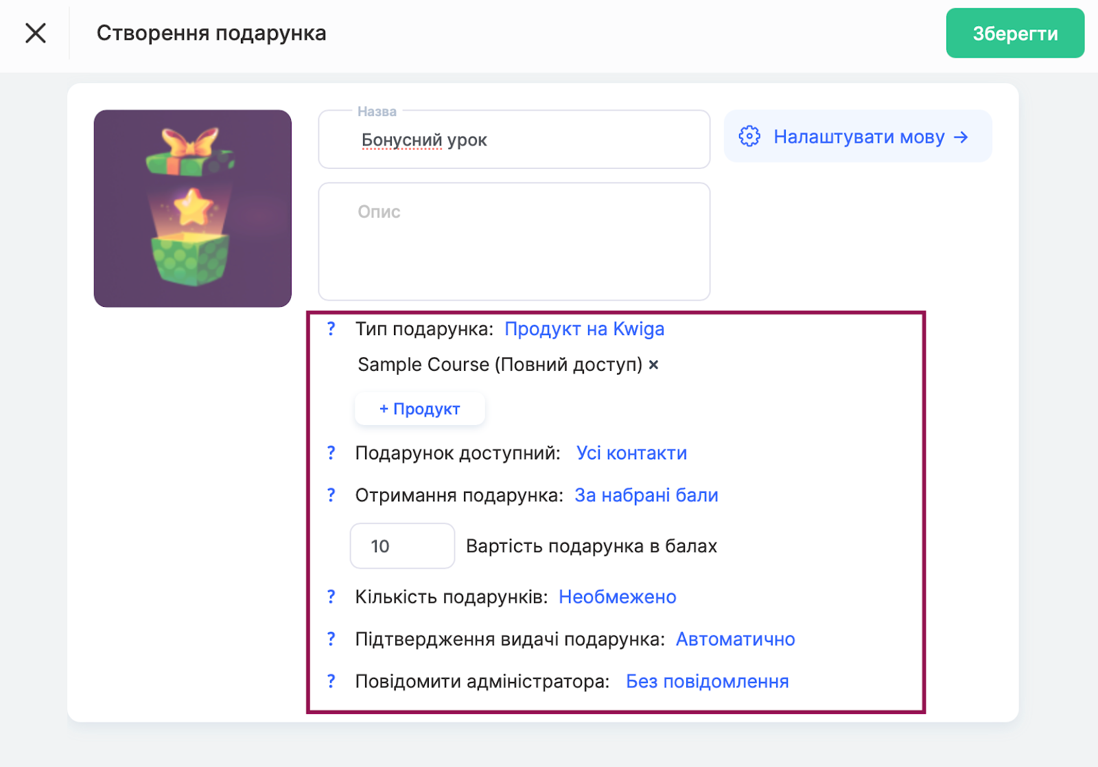 Опція За набрані бали дозволяє учню обміняти накопичені бали на подарунок. У полі Вартість подарунка в балах вкажіть, скільки балів коштує цей подарунок (наприклад, 10 балів). При визначенні вартості враховуйте, наскільки легко учні можуть заробляти бали на вашій платформі, реальну цінність подарунка та бажану швидкість досягнення винагороди.