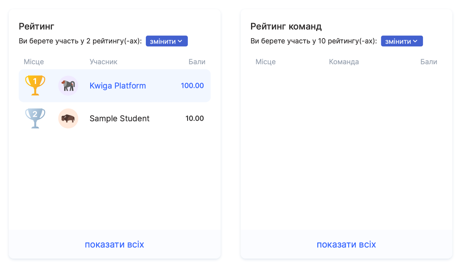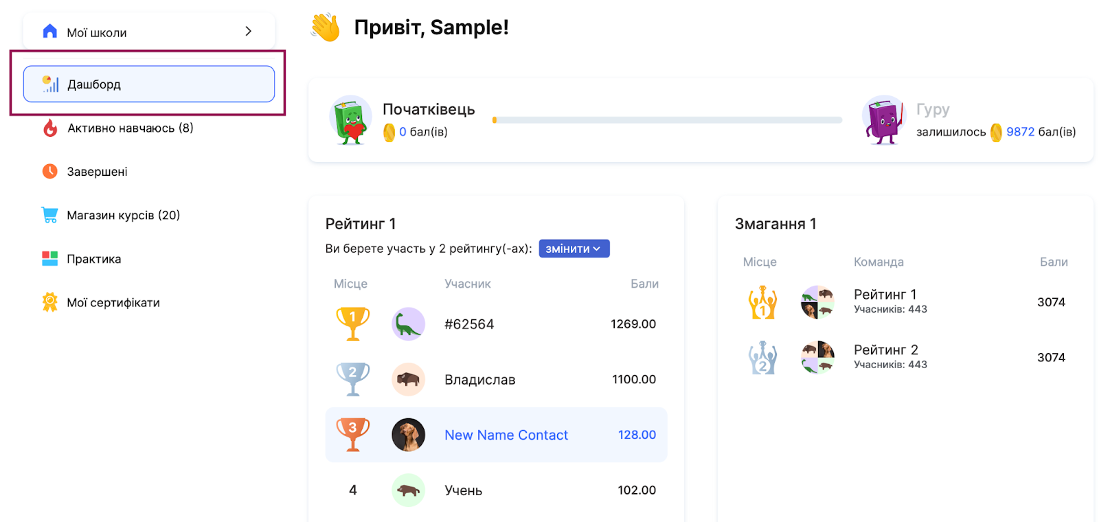 Дані щодо гейміфікації та досягнень учня знаходяться також в меню Дашборд. Тут представлено візуальне відображення статусу, рейтинги чи змагання, досягнення тощо. Це дозволяє учаснику швидко оцінити свій прогрес, порівняти результати з іншими студентами та побачити, які нагороди вже отримані, а які ще можна здобути.