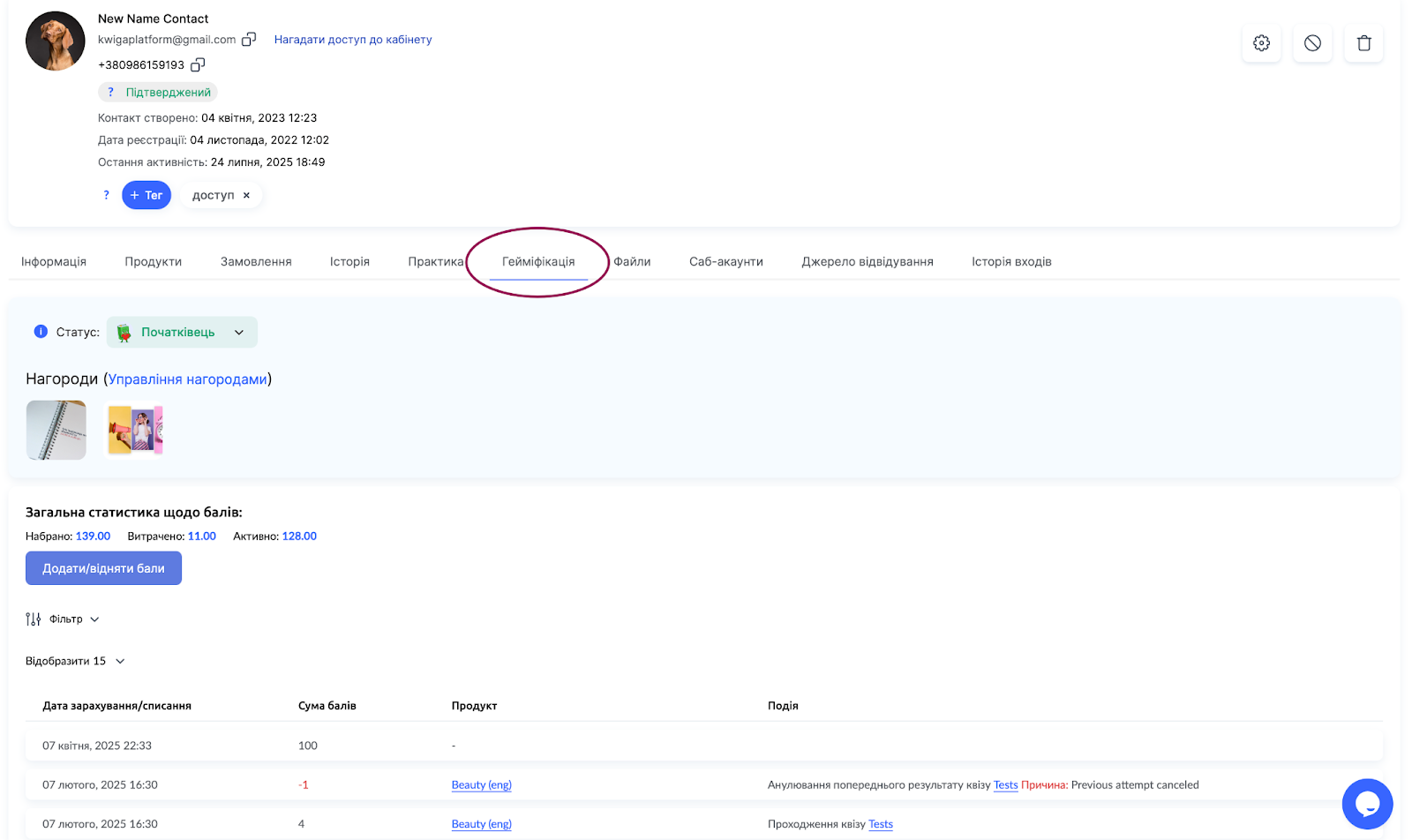 І в карточці контакту на вкладці Гейміфікація, є можливість вручну для експерта нарахувати чи зняти бали окремому учаснику. Це корисно для заохочення особливо активних студентів або коригування балансу в особливих випадках.