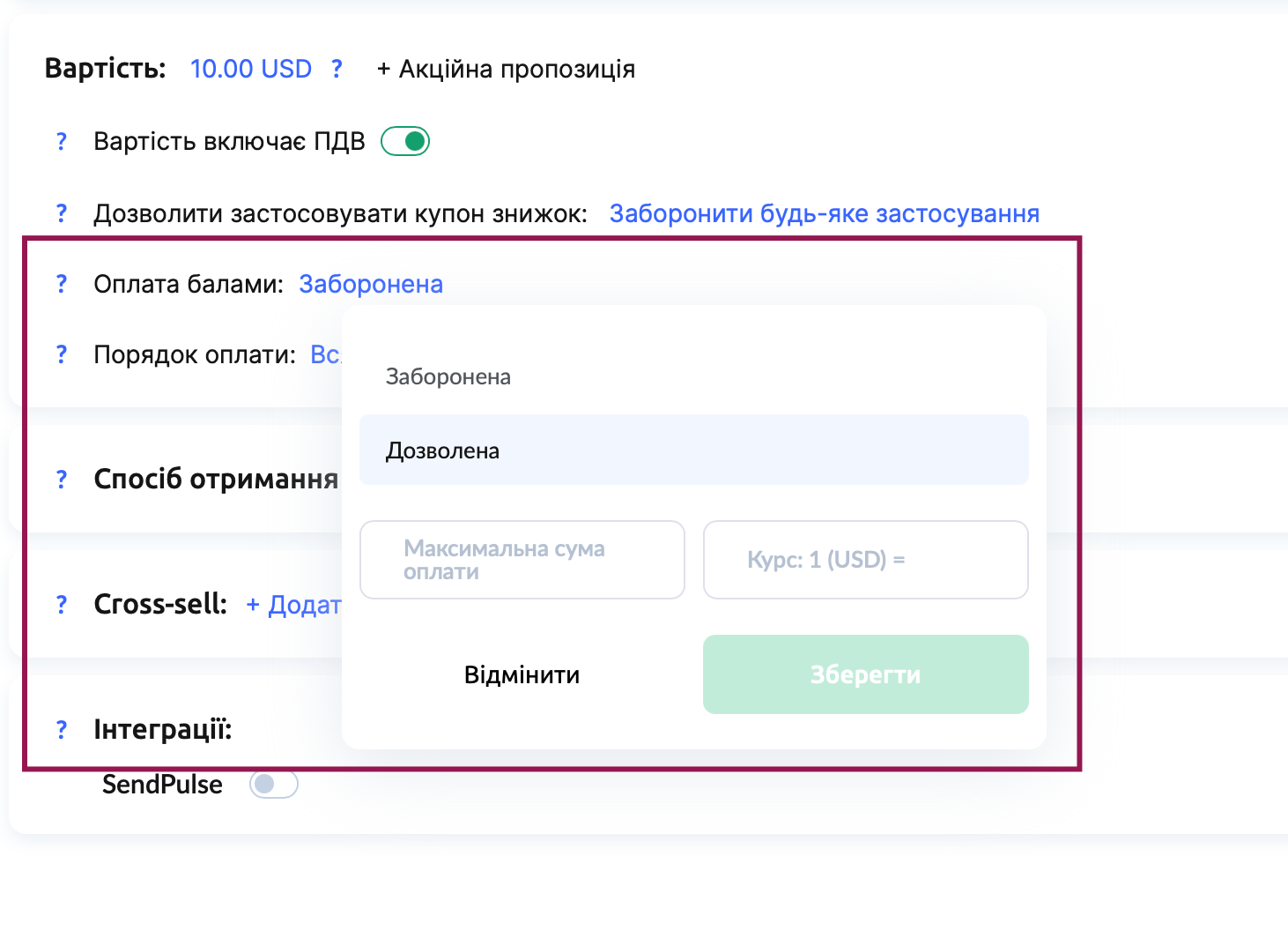 Зароблені бали можна витрачати як внутрішню валюту платформи. У налаштуваннях пропозицій доступна опція Дозволити оплату за бали (частково або повністю, за власним курсом). Наприклад, додатковий курс вартістю 500 гривень чи доларів можна дозволити оплатити та продати за 1000 балів, або дозволити змішану оплату — 300 гривень + 200 балів.