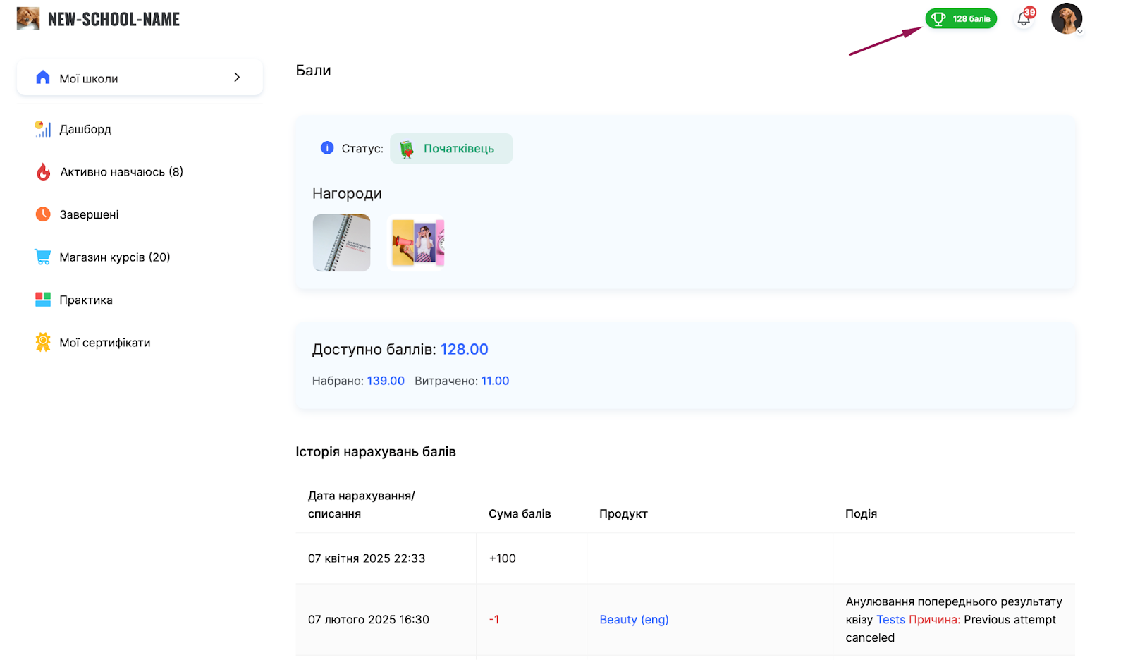 Кількість набраних балів відображається справа вгорі поруч з аватаром профіля. Якщо клікнути на них, відбудеться перехід в меню Бали, де окрім доступних балів та історії їх нарахування, можуть відображатись статус та нагороди (якщо вони активовані в проєкті).