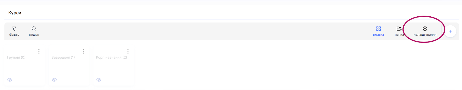 Якщо ж ви вже маєте папки та плануєте налаштувати їх відображення на сторінці проєкту або ж в кабінеті учня, то відкрийте сторінку з усіма курсами (чи марафонами). Для цього потрібно перейти в меню Курси та перейти в одне із меню в блоці Продукти, для прикладу Курси, та відкрийте Налаштування.