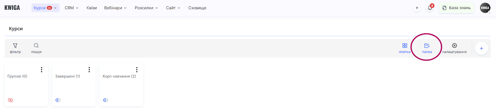 Якщо Ви ще не маєте папок у себе в акаунті, то необхідно їх створити. Для цього відкрийте в меню Курси та перейдіть в одне із меню в блоці Продукти, для прикладу Курси, та натисніть кнопку +Папка, яку позначено на скріншоті: